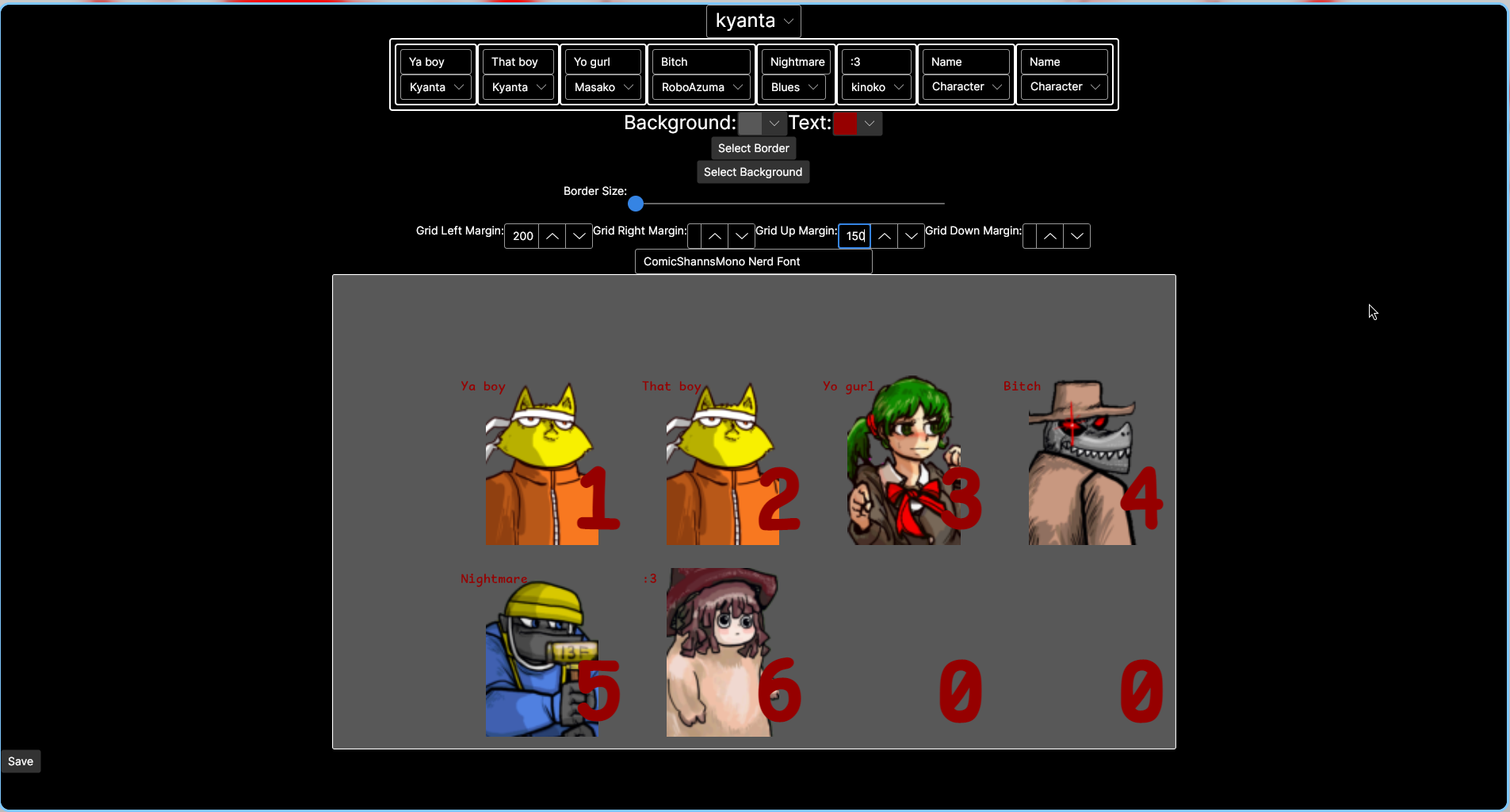 A top 8 graphic creator for my fighting game tournaments with it's main selling point being fully customizable presets. Currently paused and in a very unfinished state, but I am planning on continuing development.